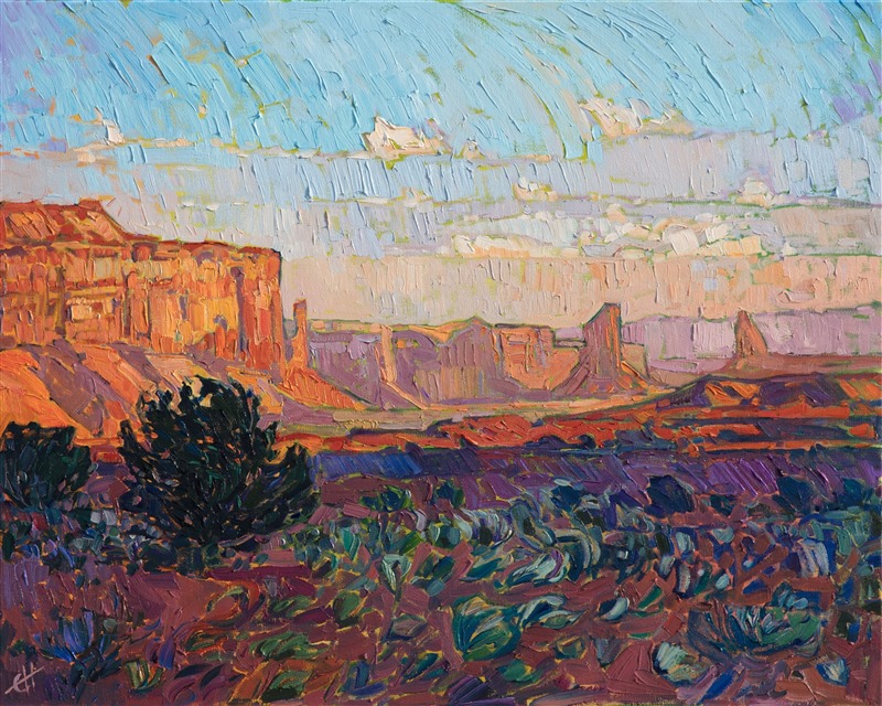 Note on varnishing: Erin’s paintings take six to eight weeks to dry, at which time we apply a retouching varnish, which allows the painting to complete the curing process while having a layer of protection against dirt and scuffs. The full curing process for an impasto oil painting takes at least two years. We are happy to assist in applying a final finishing varnish to your Erin Hanson oil painting once it has been dry for at least two years. Here is more information on how to care for your original oil painting.