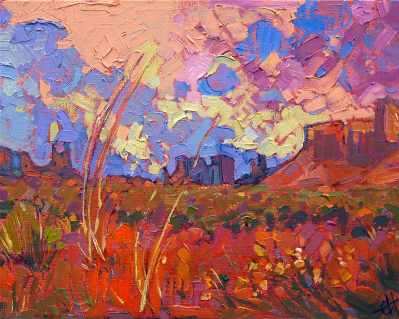 Note on varnishing: Erin’s paintings take six to eight weeks to dry, at which time we apply a retouching varnish, which allows the painting to complete the curing process while having a layer of protection against dirt and scuffs. The full curing process for an impasto oil painting takes at least two years. We are happy to assist in applying a final finishing varnish to your Erin Hanson oil painting once it has been dry for at least two years. Here is more information on how to care for your original oil painting.