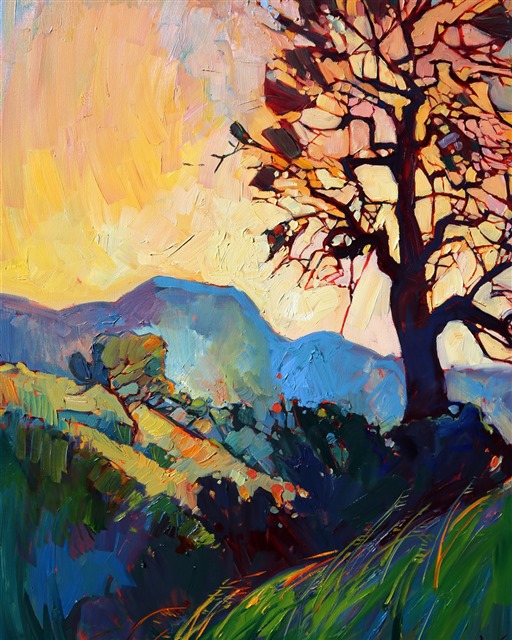 Style: "Open Impressionism" is a new style of painting developed by American artist Erin Hanson. The style is characterized by short, impasto brush strokes that are applied without layering, creating a mosaic or stained-glass appearance to the paintings. The paintings are created with a limited palette of colors, applied without blending or mixing upon the canvas, which adds a dimension of texture to each brush stroke. Inspired by classic impressionism, pointillism, and post-impressionism, Erin Hanson continues the tradition of impressionism into the modern day with her colorful and vivacious landscape paintings.
