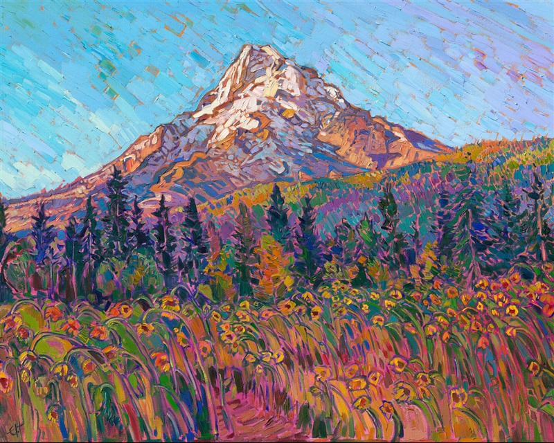I painted this view of Mt Hood from the Hood River Valley (also known as the "Fruit Loop" because of all the fruit orchards). The sunflowers were in late bloom, and the first light of morning cast a ruddy glow on the snow-dappled peak of Mount Hood. Thick, expressive brush strokes laid side by side without blending create a highly textured oil painting that is alive with motion and vibrant color.