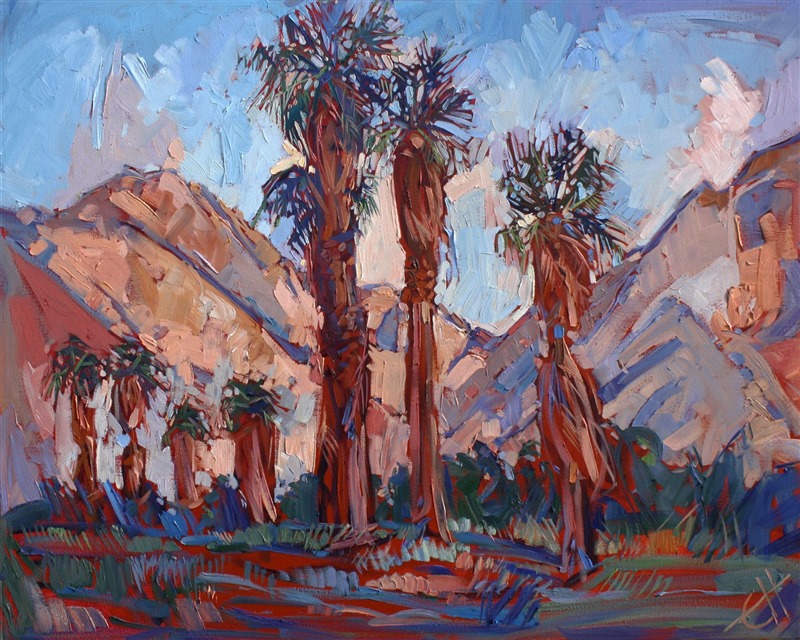 Wind rushes through these monumental palm trees standing sentry at Borrego Springs, California. The oil paint is applied in thick, loose brush strokes.