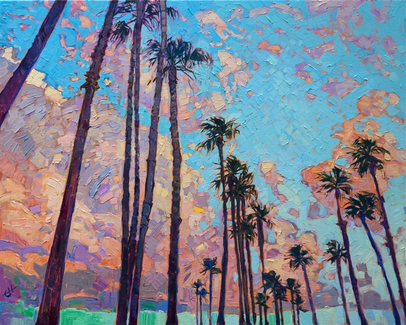 Note on varnishing: Erin’s paintings take six to eight weeks to dry, at which time we apply a retouching varnish, which allows the painting to complete the curing process while having a layer of protection against dirt and scuffs. The full curing process for an impasto oil painting takes at least two years. We are happy to assist in applying a final finishing varnish to your Erin Hanson oil painting once it has been dry for at least two years. Here is more information on how to care for your original oil painting.