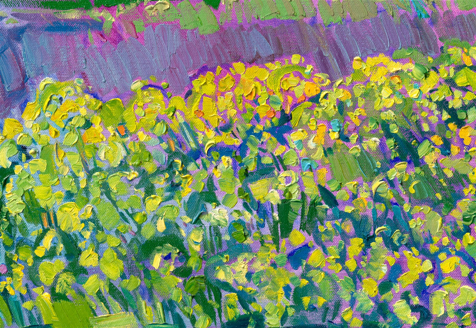 This painting captures a pair of oak trees standing above a field of mustard flowers in Oregon's Willamette Valley. Oregon's countryside is not only home to beautiful vineyards, but also flower fields, mustard plants, and hazelnut groves. This scene is captured with thick, impasto brush strokes laid side-by-side without layering, in Erin Hanson's iconic Open Impressionism style.