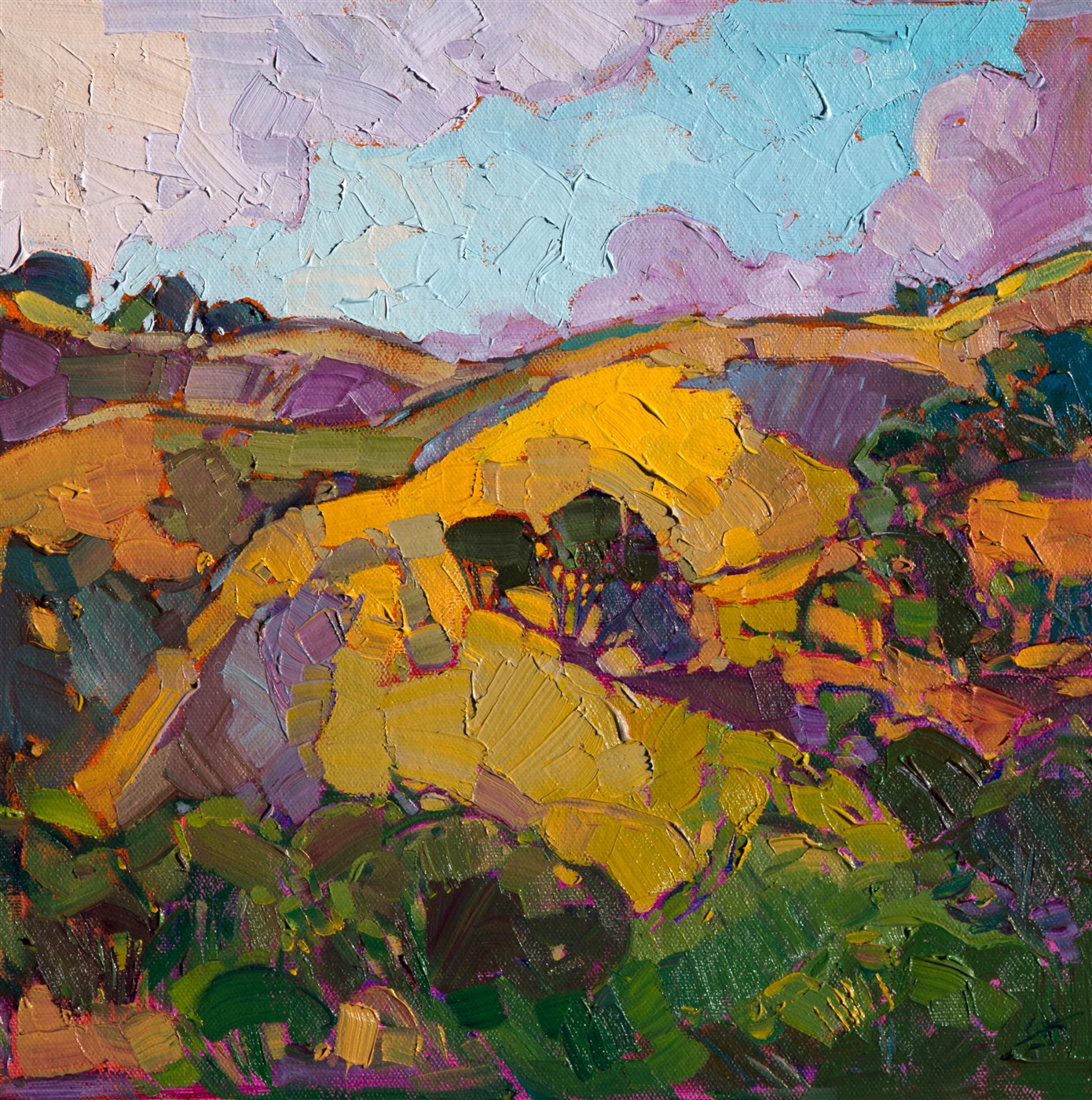 Mustard flowers bring a stroke of color to these rolling hills of central California. The expressionist brush strokes add a lively sense of movement to the painting.