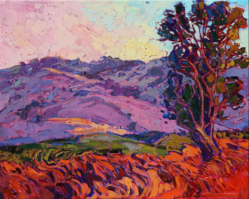 Style: "Open Impressionism" is a new style of painting developed by American artist Erin Hanson. The style is characterized by short, impasto brush strokes that are applied without layering, creating a mosaic or stained-glass appearance to the paintings. The paintings are created with a limited palette of colors, applied without blending or mixing upon the canvas, which adds a dimension of texture to each brush stroke. Inspired by classic impressionism, pointillism, and post-impressionism, Erin Hanson continues the tradition of impressionism into the modern day with her colorful and vivacious landscape paintings.