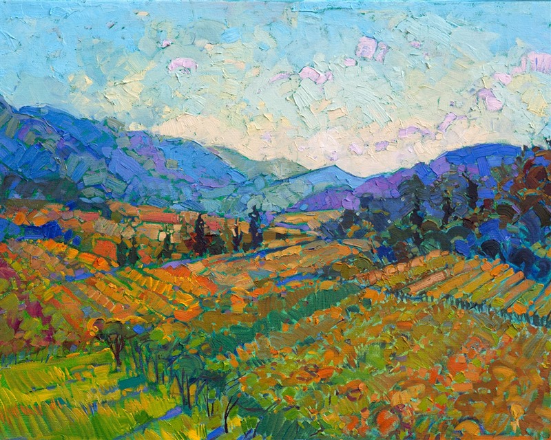 Style: "Open Impressionism" is a new style of painting developed by American artist Erin Hanson. The style is characterized by short, impasto brush strokes that are applied without layering, creating a mosaic or stained-glass appearance to the paintings. The paintings are created with a limited palette of colors, applied without blending or mixing upon the canvas, which adds a dimension of texture to each brush stroke. Inspired by classic impressionism, pointillism, and post-impressionism, Erin Hanson continues the tradition of impressionism into the modern day with her colorful and vivacious landscape paintings.