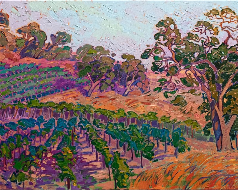 "Napa Summer" was created on 1-1/2" canvas, with the painting continued around the edges. The piece arrives framed in a contemporary gold floater frame.