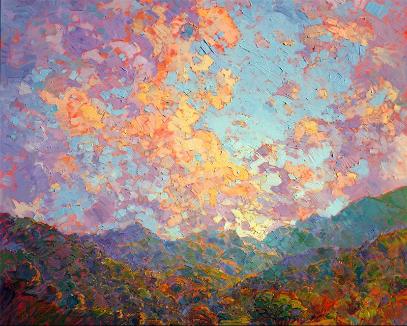 Style: "Open Impressionism" is a new style of painting developed by American artist Erin Hanson. The style is characterized by short, impasto brush strokes that are applied without layering, creating a mosaic or stained-glass appearance to the paintings. The paintings are created with a limited palette of colors, applied without blending or mixing upon the canvas, which adds a dimension of texture to each brush stroke. Inspired by classic impressionism, pointillism, and post-impressionism, Erin Hanson continues the tradition of impressionism into the modern day with her colorful and vivacious landscape paintings.