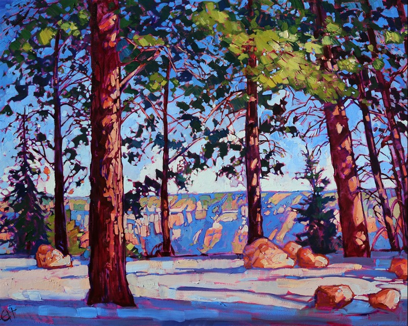 Having spent so many years painting the Arizona landscape, it is strange that it wasn't until last November that Erin finally made it to the Grand Canyon. This is a painting of the north rim, a light dusting of snow still on the ground, the air cool and crisp beneath the evergreens.