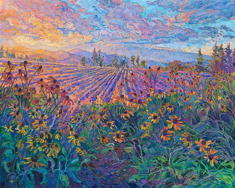 This painting was inspired by a patch of vibrant yellow flowers growing in a field outside my house. The warm colors of late afternoon add a layer of gilding to the landscape, bathing it in a wash of golden light. The painting was created in Erin Hanson's signature Open Impressionism style, with brush strokes laid side-by-side, without layering, creating a painterly and highly textured oil painting.