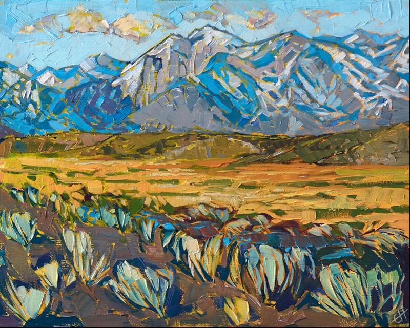 ERIN HANSON has been painting in oils since she was 8 years old. As a teenager, she apprenticed at a mural studio where she worked on 40-foot-long paintings while selling art commissions on the side. After being told it was too hard to make a living as an artist, she got her degree in Bioengineering from UC Berkeley. Afterward, Erin became a rock climber at Red Rock Canyon, Nevada. Inspired by the colorful scenery she was climbing, she decided to return to her love of painting and create one new painting every week.