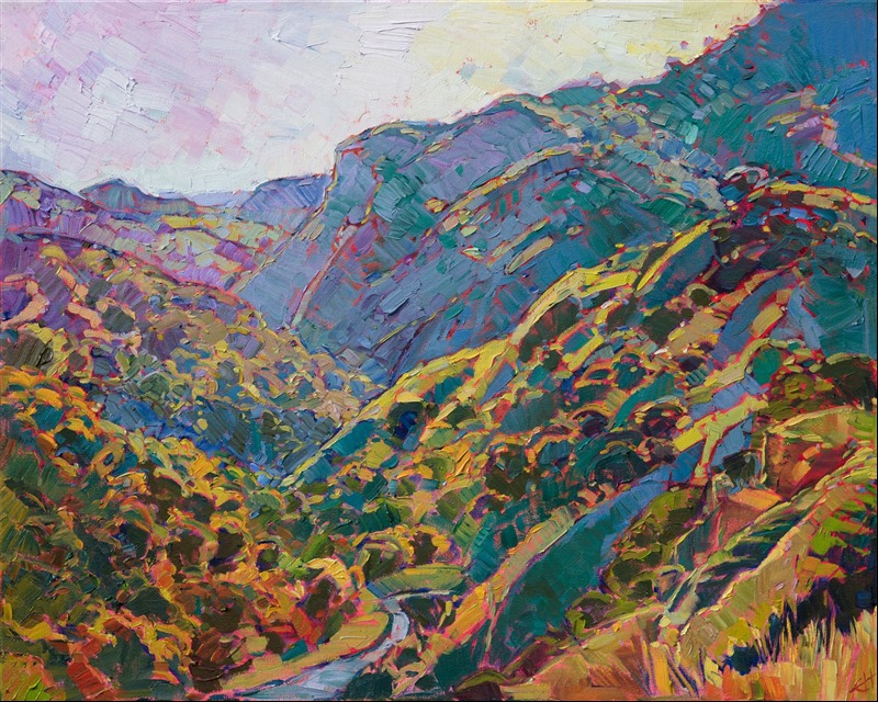 ERIN HANSON has been painting in oils since she was 8 years old. As a teenager, she apprenticed at a mural studio where she worked on 40-foot-long paintings while selling art commissions on the side. After being told it was too hard to make a living as an artist, she got her degree in Bioengineering from UC Berkeley. Afterward, Erin became a rock climber at Red Rock Canyon, Nevada. Inspired by the colorful scenery she was climbing, she decided to return to her love of painting and create one new painting every week.
