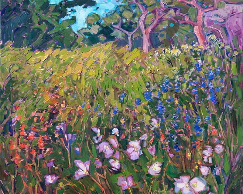 A rainbow of wildflowers dances beneath the oaks in this contemporary impressionist painting. Loose, painterly brush strokes capture the movement and color of the outdoors.