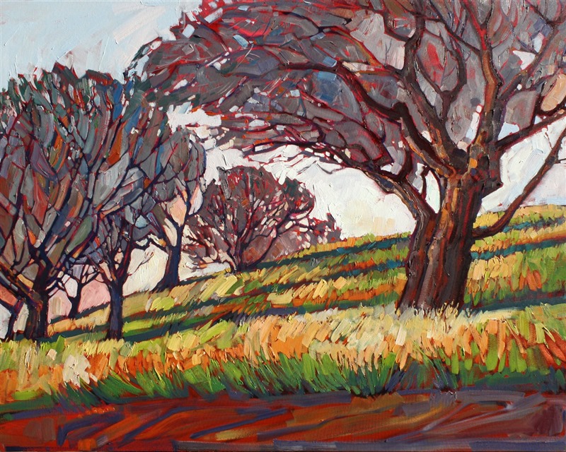 Style: "Open Impressionism" is a new style of painting developed by American artist Erin Hanson. The style is characterized by short, impasto brush strokes that are applied without layering, creating a mosaic or stained-glass appearance to the paintings. The paintings are created with a limited palette of colors, applied without blending or mixing upon the canvas, which adds a dimension of texture to each brush stroke. Inspired by classic impressionism, pointillism, and post-impressionism, Erin Hanson continues the tradition of impressionism into the modern day with her colorful and vivacious landscape paintings.