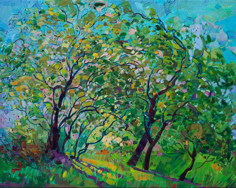 Sparkling color refracts through the leaves of these California oaks. This expressionist painting uses texture and emotional color to bring the landscape to life.