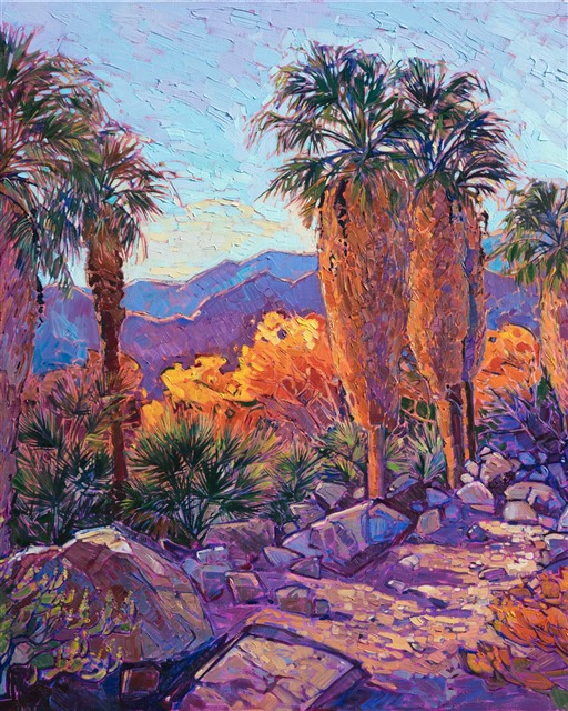 Note on varnishing: Erin’s paintings take six to eight weeks to dry, at which time we apply a retouching varnish, which allows the painting to complete the curing process while having a layer of protection against dirt and scuffs. The full curing process for an impasto oil painting takes at least two years. We are happy to assist in applying a final finishing varnish to your Erin Hanson oil painting once it has been dry for at least two years. Here is more information on how to care for your original oil painting.