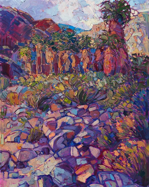 This abstract desert landscape painting has a contemporary blend of impressionism and expressionism, in a modern style dubbed Open Impressionism, by Erin Hanson. The California desert is full of beautiful color and transient light in the early dawn. The brush strokes are loose and full of motion, creating a tapestry of color and texture across the canvas.