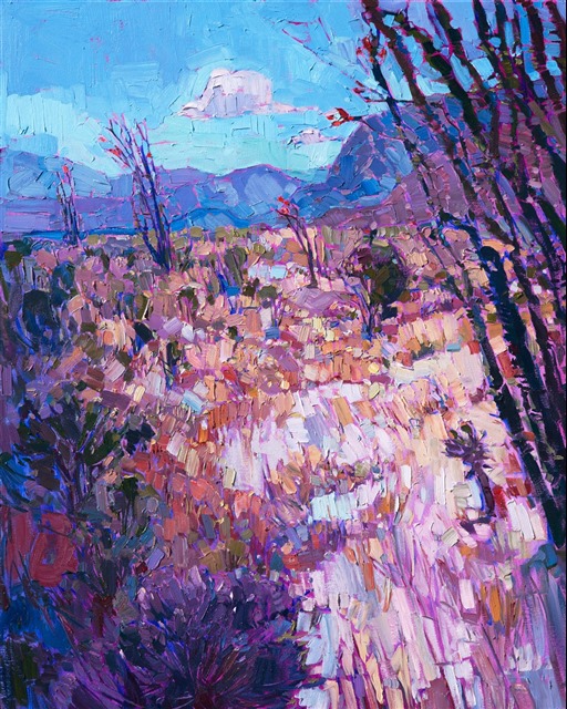 Borrego Springs in California's southern desert becomes alive with color in the springtime. The desert scrub blooms with purple and yellow flowers, while the stately ocotillos give birth to bright red, bird-like flowers. This oil painting is painted with loose, painterly brush strokes, creating a sense of motion within the painting.