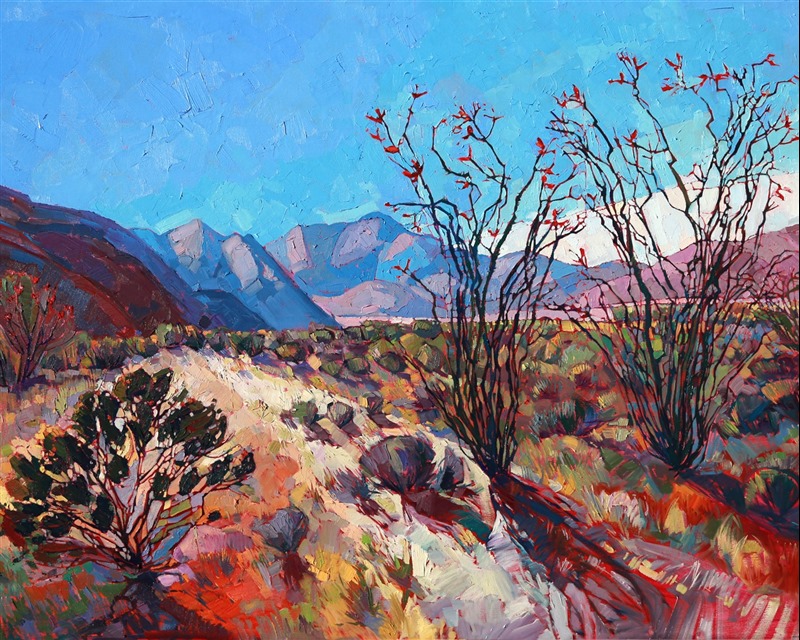 Fresh color and vibrant brush strokes bring the Anza-Borrego desert to life. This painting captures the movement and energy of the California desert, where subtle beauty lurks in every shadow and scrub bush.