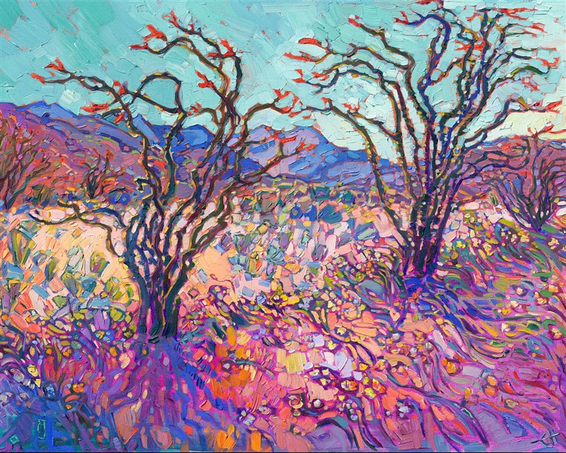 "Ocotillo in Color" is an original oil painting by Erin Hanson. The piece arrives framed in a custom gold floater frame, ready to hang.