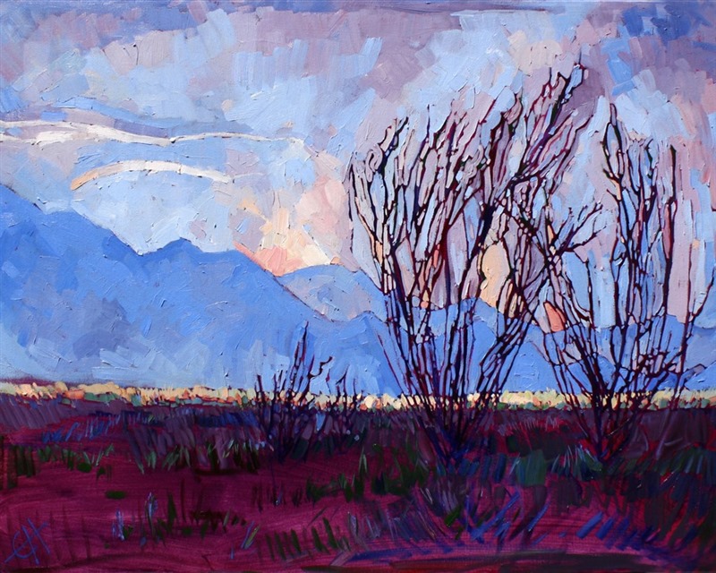 Style: "Open Impressionism" is a new style of painting developed by American artist Erin Hanson. The style is characterized by short, impasto brush strokes that are applied without layering, creating a mosaic or stained-glass appearance to the paintings. The paintings are created with a limited palette of colors, applied without blending or mixing upon the canvas, which adds a dimension of texture to each brush stroke. Inspired by classic impressionism, pointillism, and post-impressionism, Erin Hanson continues the tradition of impressionism into the modern day with her colorful and vivacious landscape paintings.