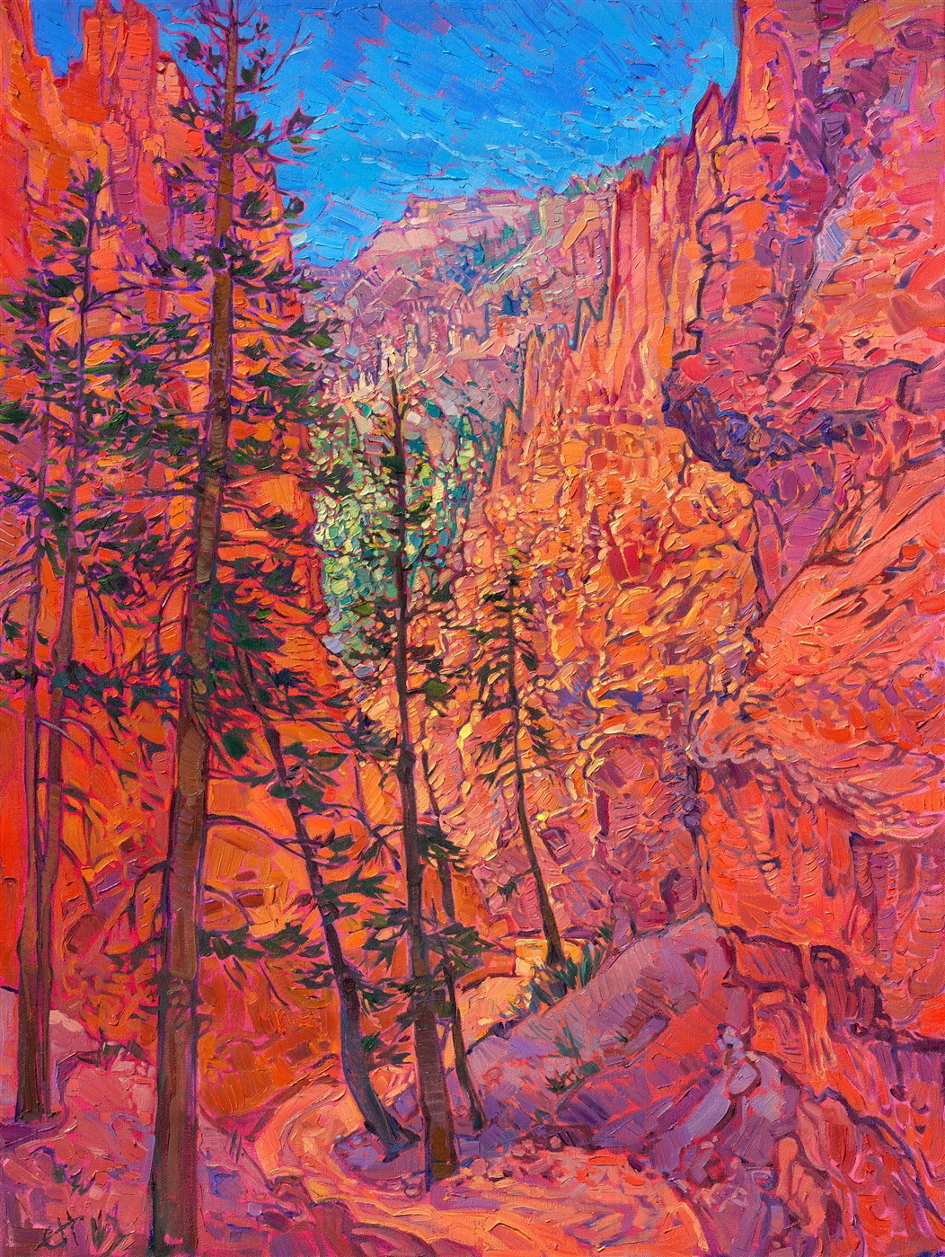 Hiking down into Bryce Canyon is a surreal experience everyone should do once in their lifetime. The looming hoodoos and sandstone rock formations make you feel transported to another world. This painting captures the otherworldly effect of this beautiful National Park.