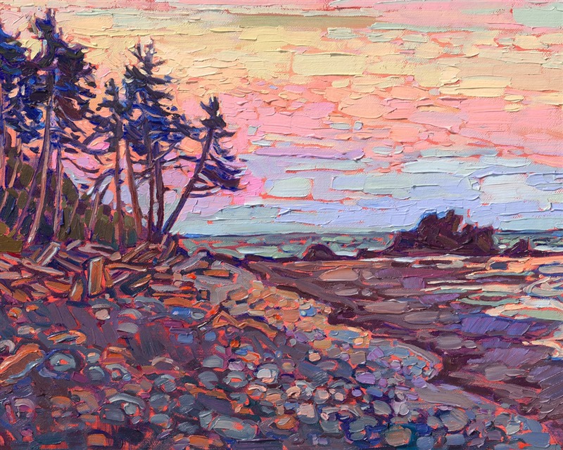 Ruby Beach on the Olympic Peninsula was one of the highlights of my trip to Washington. I got there right at the peak of golden hour, and I watched the sky change into a rainbow of fiery hues. This petite painting captures the Washington coast vista in thick, impasto brushstrokes--a small, but epic, landscape captured on a 16" canvas.