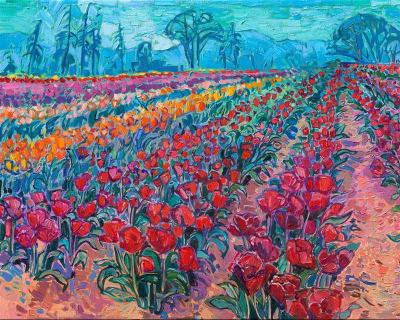 Every spring I visit Woodburn's tulip fields for the color and inspiration. Bands of vibrant blooms stretch far into the distance, with distant blue mountains all around (and sometimes even a glimpse of Mt Hood). I love capturing the structured tulip shapes and soft green colors of the leaves on canvas.