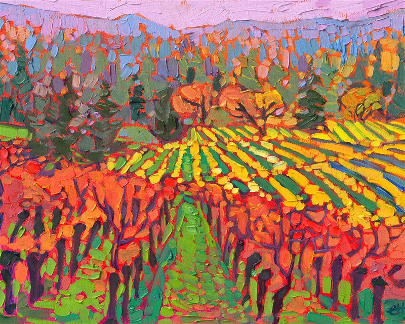 Note on varnishing: Erin’s paintings take six to eight weeks to dry, at which time we apply a retouching varnish, which allows the painting to complete the curing process while having a layer of protection against dirt and scuffs. The full curing process for an impasto oil painting takes at least two years. We are happy to assist in applying a final finishing varnish to your Erin Hanson oil painting once it has been dry for at least two years. Here is more information on how to care for your original oil painting.