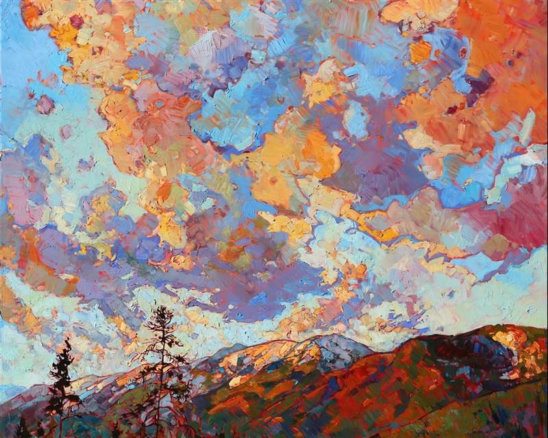 Style: "Open Impressionism" is a new style of painting developed by American artist Erin Hanson. The style is characterized by short, impasto brush strokes that are applied without layering, creating a mosaic or stained-glass appearance to the paintings. The paintings are created with a limited palette of colors, applied without blending or mixing upon the canvas, which adds a dimension of texture to each brush stroke. Inspired by classic impressionism, pointillism, and post-impressionism, Erin Hanson continues the tradition of impressionism into the modern day with her colorful and vivacious landscape paintings.
