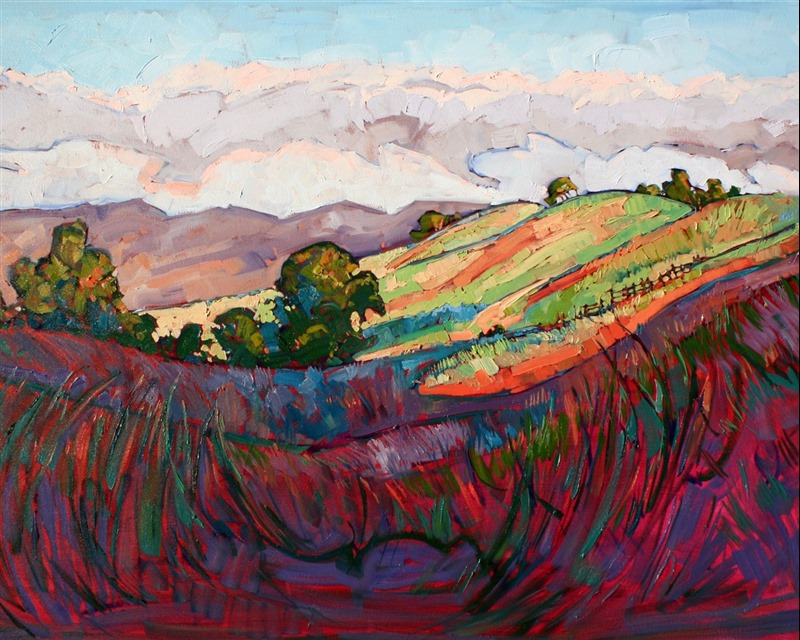 Loose brush strokes capture the movement and feel of Paso Robles, California. The multi-colored hillsides have a very painterly feel.