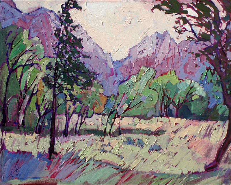 Soft lavender light of early dawn is captured in the Zion canyon, the fragile and delicate colors a contrast with the heavily applied paint strokes. This painting truly captures the beauty and stillness of Zion just before the sun breaks into the canyon.