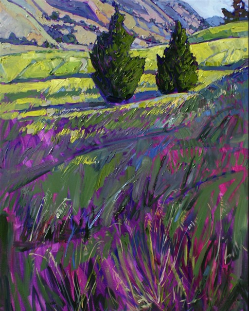 Style: "Open Impressionism" is a new style of painting developed by American artist Erin Hanson. The style is characterized by short, impasto brush strokes that are applied without layering, creating a mosaic or stained-glass appearance to the paintings. The paintings are created with a limited palette of colors, applied without blending or mixing upon the canvas, which adds a dimension of texture to each brush stroke. Inspired by classic impressionism, pointillism, and post-impressionism, Erin Hanson continues the tradition of impressionism into the modern day with her colorful and vivacious landscape paintings.