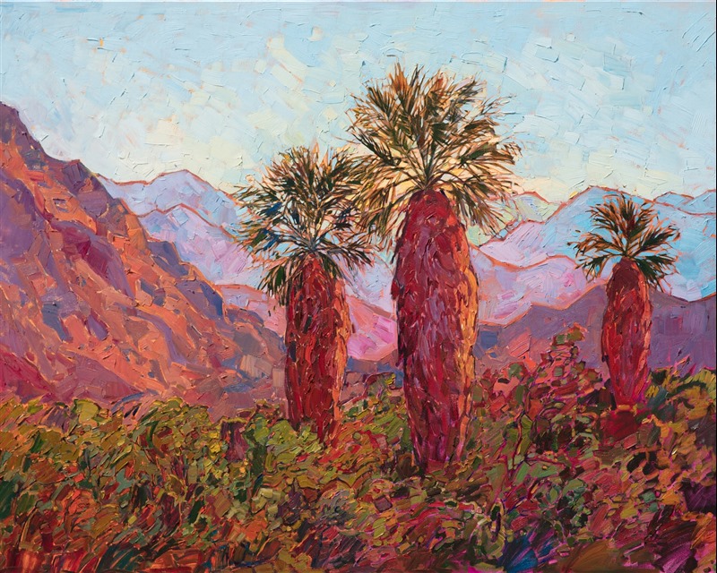Note on varnishing: Erin’s paintings take six to eight weeks to dry, at which time we apply a retouching varnish, which allows the painting to complete the curing process while having a layer of protection against dirt and scuffs. The full curing process for an impasto oil painting takes at least two years. We are happy to assist in applying a final finishing varnish to your Erin Hanson oil painting once it has been dry for at least two years. Here is more information on how to care for your original oil painting.