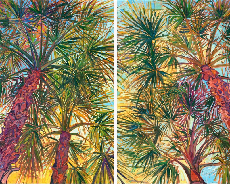 "Palm Fronds" is an original oil painting diptych, created on two canvases that are 1-1/2" deep. The painting is continued around the edges of the canvas for a wrap-around look. The painting is designed to hang unframed, with 2" of space between the canvases. (So the total length when hung would be 58".)