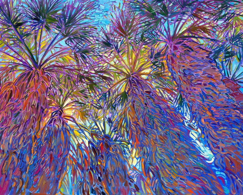 Looking up into the palm tree fronds at Indian Canyon Palm Oasis is the quintessential experience of Palm Springs. This painting captures the beauty and color of the desert with wide, expressive brush strokes and subtle color variations.