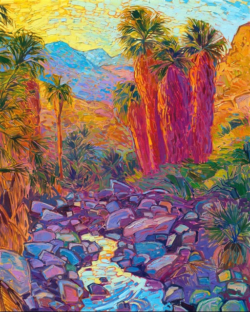 This painting captures the vivid colors of the California desert. The piece was inspired by hiking in Indian Canyons, near Palm Springs. The cool waters of the oasis contrast with the warm colors of sunset sparkling on the desert mountains beyond.