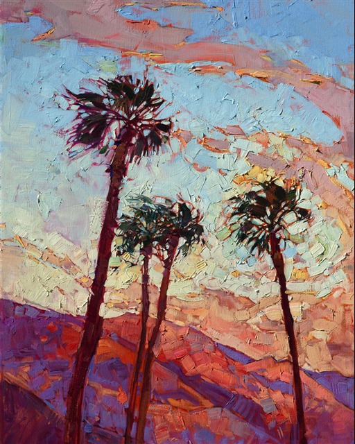 Desert winds blow through these iconic palms of Palm Springs, the sunset light catching in the fronds. The mosaic light creates a stained glass pattern of color across the desert sky.