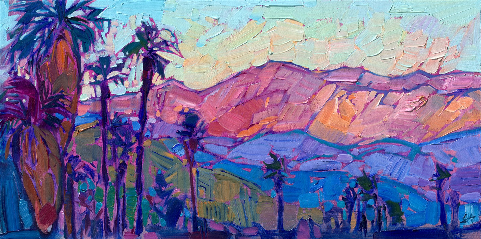 Note on varnishing: Erin’s paintings take six to eight weeks to dry, at which time we apply a retouching varnish, which allows the painting to complete the curing process while having a layer of protection against dirt and scuffs. The full curing process for an impasto oil painting takes at least two years. We are happy to assist in applying a final finishing varnish to your Erin Hanson oil painting once it has been dry for at least two years. Here is more information on how to care for your original oil painting.