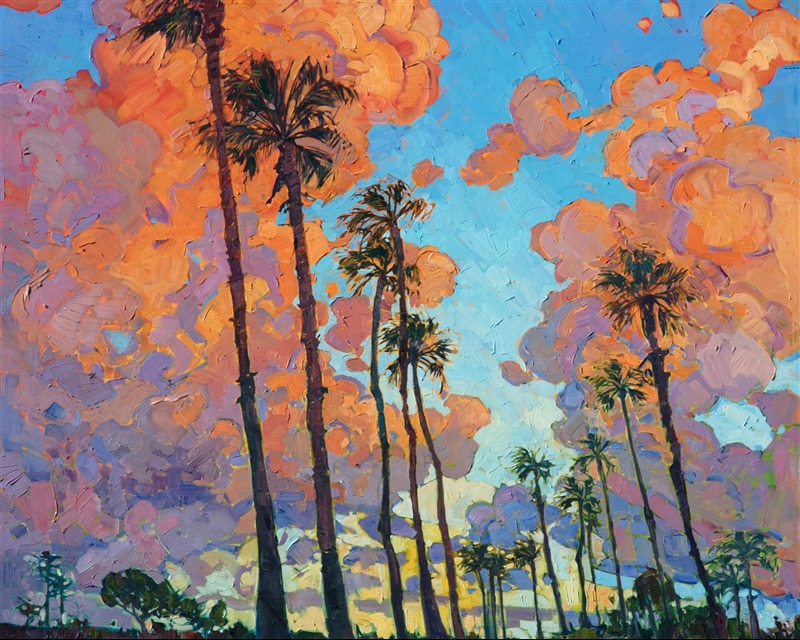 Note on varnishing: Erin’s paintings take six to eight weeks to dry, at which time we apply a retouching varnish, which allows the painting to complete the curing process while having a layer of protection against dirt and scuffs. The full curing process for an impasto oil painting takes at least two years. We are happy to assist in applying a final finishing varnish to your Erin Hanson oil painting once it has been dry for at least two years. Here is more information on how to care for your original oil painting.