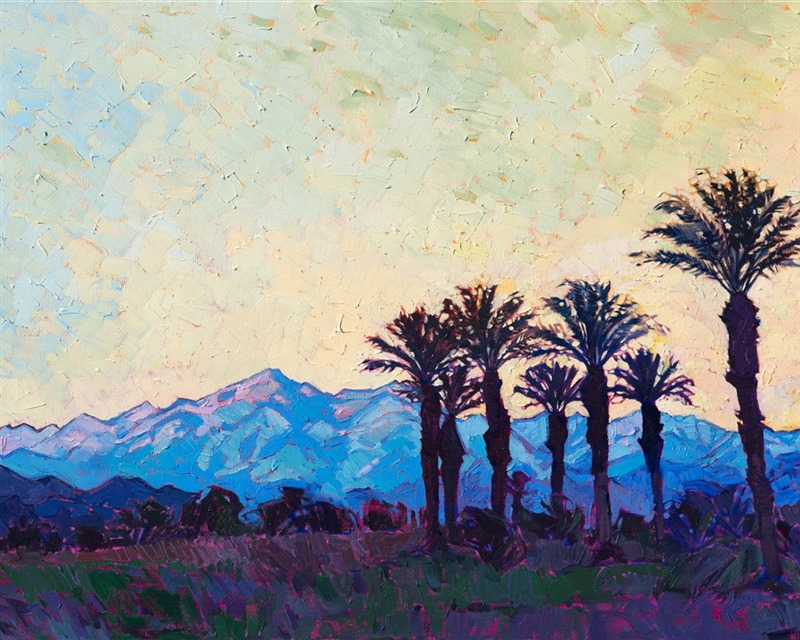 Note on varnishing: Erin’s paintings take six to eight weeks to dry, at which time we apply a retouching varnish, which allows the painting to complete the curing process while having a layer of protection against dirt and scuffs. The full curing process for an impasto oil painting takes at least two years. We are happy to assist in applying a final finishing varnish to your Erin Hanson oil painting once it has been dry for at least two years. Here is more information on how to care for your original oil painting.