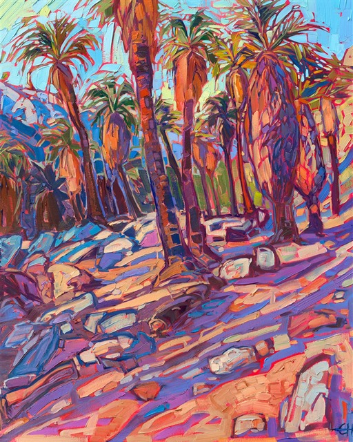 "Palms Oasis" is an original oil painting created on 1-1/2" deep canvas. The painting arrives framed in a contemporary gold floating frame.