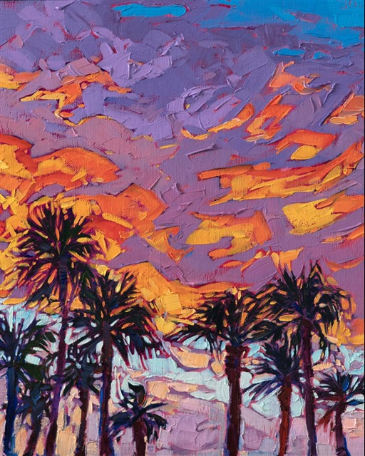 A brilliant sky bursts above the palms in Palm Springs. The brush strokes in this painting are loose and impressionistic, alive with color and motion.