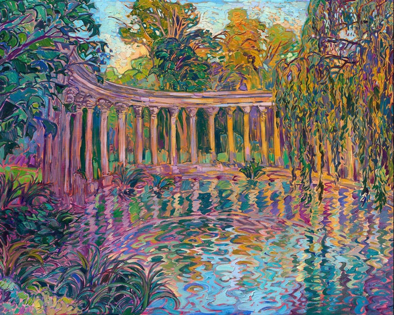 Parc Monceau is the most beautiful park I visited while in Paris. Here, I understood why the impressionists painted predominantly in hues of blue and green. The lush gardens and quiet pond around the ancient-looking colonnade transported me back to a simpler time, a peaceful time, when spending a day in the gardens with one's friends was the ordinary thing to do. This painting captures that feeling of peace for me.