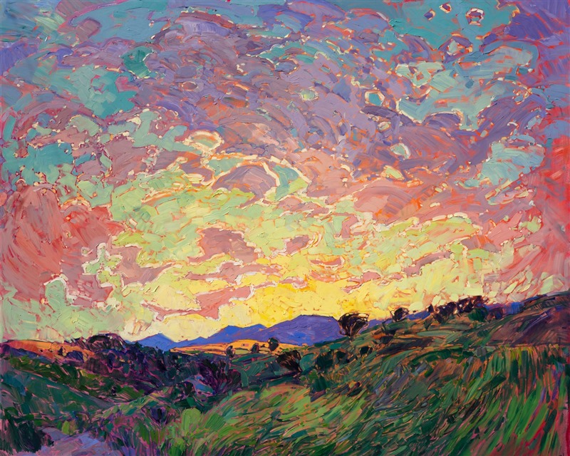 Note on varnishing: Erin’s paintings take six to eight weeks to dry, at which time we apply a retouching varnish, which allows the painting to complete the curing process while having a layer of protection against dirt and scuffs. The full curing process for an impasto oil painting takes at least two years. We are happy to assist in applying a final finishing varnish to your Erin Hanson oil painting once it has been dry for at least two years. Here is more information on how to care for your original oil painting.