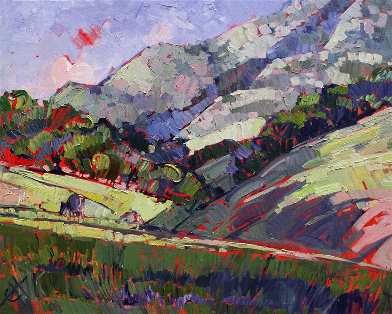 Style: "Open Impressionism" is a new style of painting developed by American artist Erin Hanson. The style is characterized by short, impasto brush strokes that are applied without layering, creating a mosaic or stained-glass appearance to the paintings. The paintings are created with a limited palette of colors, applied without blending or mixing upon the canvas, which adds a dimension of texture to each brush stroke. Inspired by classic impressionism, pointillism, and post-impressionism, Erin Hanson continues the tradition of impressionism into the modern day with her colorful and vivacious landscape paintings.