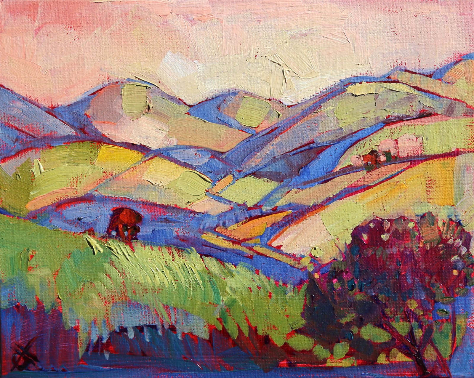 Style: "Open Impressionism" is a new style of painting developed by American artist Erin Hanson. The style is characterized by short, impasto brush strokes that are applied without layering, creating a mosaic or stained-glass appearance to the paintings. The paintings are created with a limited palette of colors, applied without blending or mixing upon the canvas, which adds a dimension of texture to each brush stroke. Inspired by classic impressionism, pointillism, and post-impressionism, Erin Hanson continues the tradition of impressionism into the modern day with her colorful and vivacious landscape paintings.