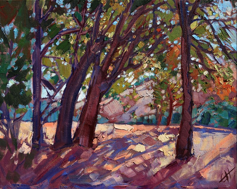 Style: "Open Impressionism" is a new style of painting developed by American artist Erin Hanson. The style is characterized by short, impasto brush strokes that are applied without layering, creating a mosaic or stained-glass appearance to the paintings. The paintings are created with a limited palette of colors, applied without blending or mixing upon the canvas, which adds a dimension of texture to each brush stroke. Inspired by classic impressionism, pointillism, and post-impressionism, Erin Hanson continues the tradition of impressionism into the modern day with her colorful and vivacious landscape paintings.
