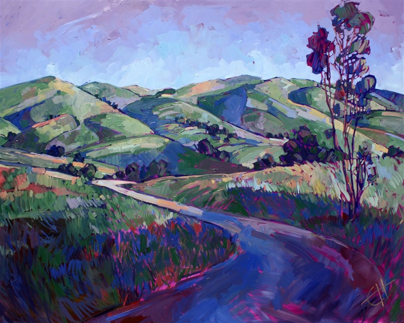 Style: "Open Impressionism" is a new style of painting developed by American artist Erin Hanson. The style is characterized by short, impasto brush strokes that are applied without layering, creating a mosaic or stained-glass appearance to the paintings. The paintings are created with a limited palette of colors, applied without blending or mixing upon the canvas, which adds a dimension of texture to each brush stroke. Inspired by classic impressionism, pointillism, and post-impressionism, Erin Hanson continues the tradition of impressionism into the modern day with her colorful and vivacious landscape paintings.
