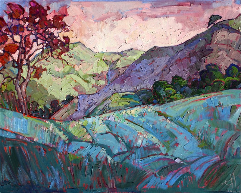 Style: "Open Impressionism" is a new style of painting developed by American artist Erin Hanson. The style is characterized by short, impasto brush strokes that are applied without layering, creating a mosaic or stained-glass appearance to the paintings. The paintings are created with a limited palette of colors, applied without blending or mixing upon the canvas, which adds a dimension of texture to each brush stroke. Inspired by classic impressionism, pointillism, and post-impressionism, Erin Hanson continues the tradition of impressionism into the modern day with her colorful and vivacious landscape paintings.